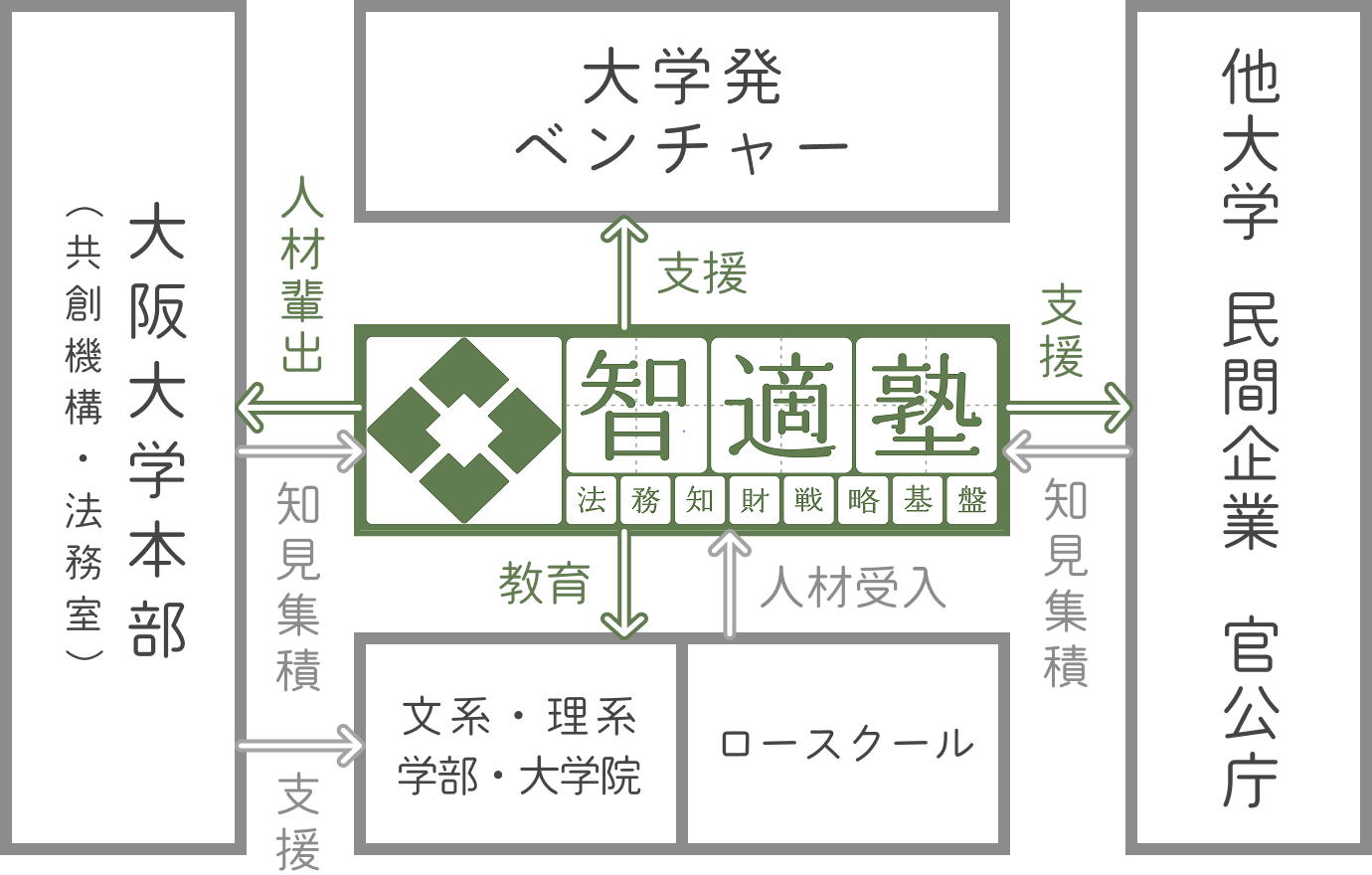智適塾では、研究成果の事業化や知的財産の戦略的活用を推進する「法務知財戦略基盤」の構築を通し、長期的な産業の進展に寄与していきます。